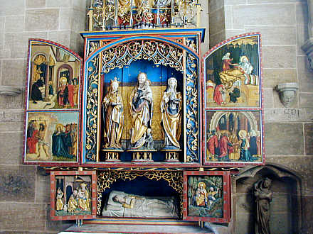 Marienaltar (südl. Seitenchor), Anf. 16. Jahrhundert Muttergottes mit der heiligen Odilia und der heiligen Lucia, auf den Seitenflügeln Szenen aus dem Marienleben und Christus als Beschwichtiger des göttlichen Zorns. Im Gespreng eine Marienkrönung |