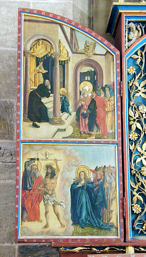 Marienaltar (südl. Seitenchor), Anf. 16. Jahrhundert Linker Seitenflügel: Szene aus dem Marienleben , darunter Christus, wie er den Zorn Gottes gegen die Menschheit beschwichtigt |