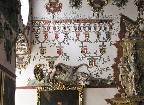 Rechts und links des Kamins die Ahnenreihe des Bauherrn, in der sich seine Legitimität als regierender Fürst manifestiert. Graf Wolfgang von Hohenlohe (1546 - 1610) liegt hier, in Umkehrung des Bildes von der Wurzel Jesse, als der, in dem sich der Hohenlohische Stamm vereinigt. Rechts des Kamins entsprechend die Ahnenreihe seiner Ehefrau Magdalena.