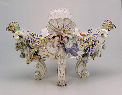 Als eines von mehreren Gewürzbehältnissen Teil eines Tafelaufsatzes, gehört zu den Bestellungen des Grafen Brühl, des sächsischen Kabinettsministers und zugleich Leiters der Meißner Manufaktur.
