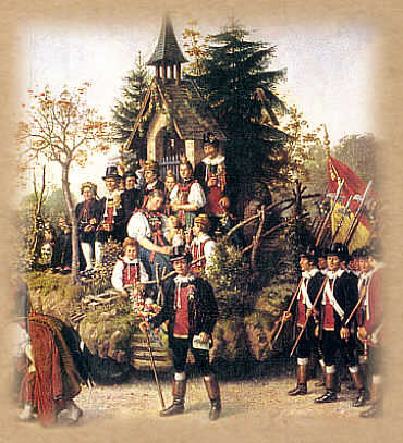 Im Zentrum des Bildes steht der Wagen der Goldenen Hochzeit mit einer Darstellung der Lebensalter des Menschen vor einer Kapelle. Diese Kapelle symbolisiert als Memento Mori" den Weg des Menschen zum Tod hin, die ganze Gruppe mit dem Brautpaar der Goldenen Hochzeit inmitten der Kinder und Enkel ist ein Hohes Lied auf die Familie in ihrem engen Bezug zur Religion. |