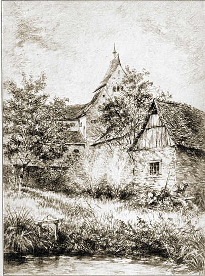 Blick vom nördlichen Ufer (heute Jachthafen) auf den Westturm der Klosterkirche Mittelzell. Perspektivisch möglicherweise verkürzt.