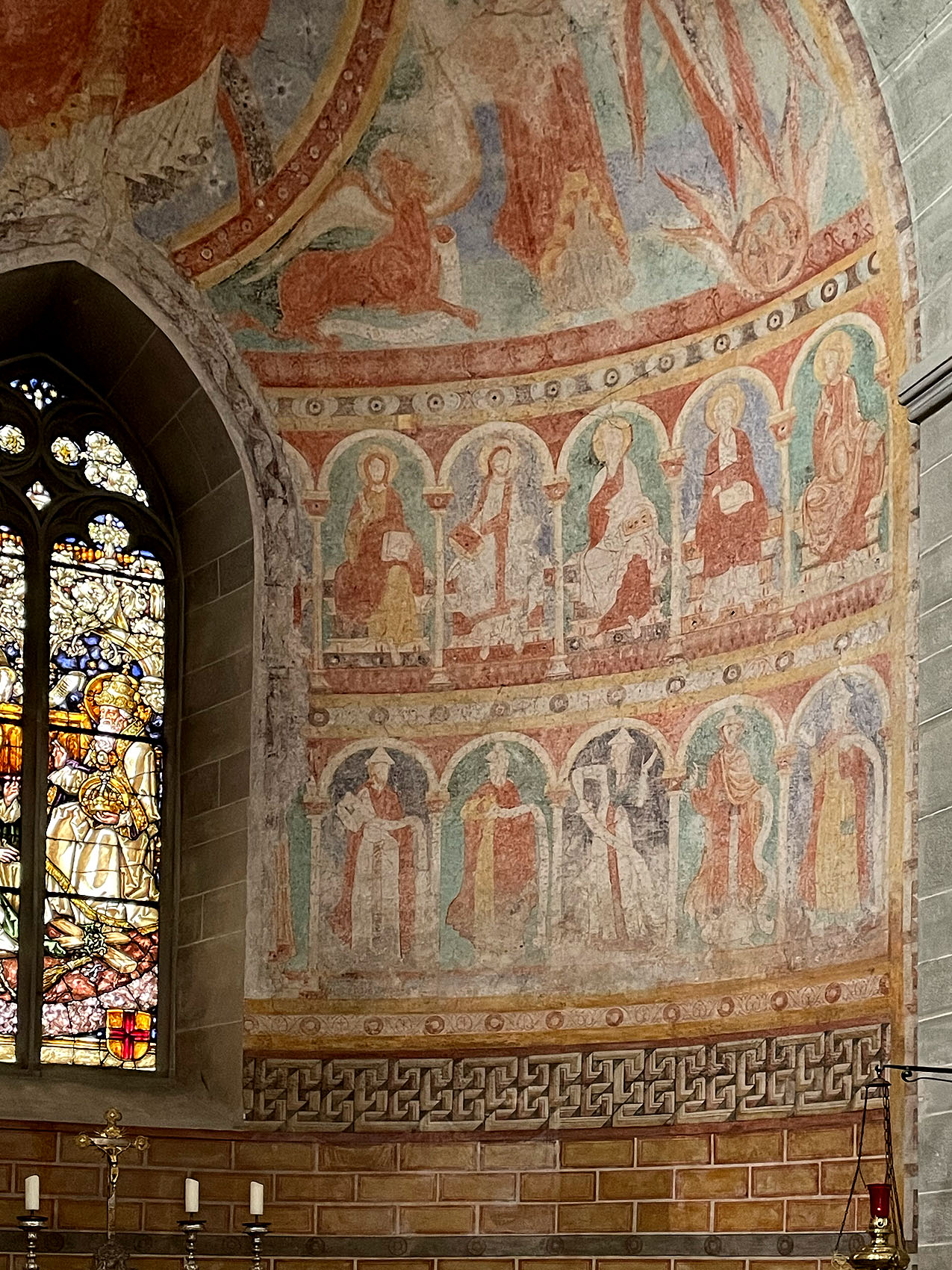 Darunter zwei durch Arkaden gegliederte Zonen - durch das gotische Maßwerkfenster