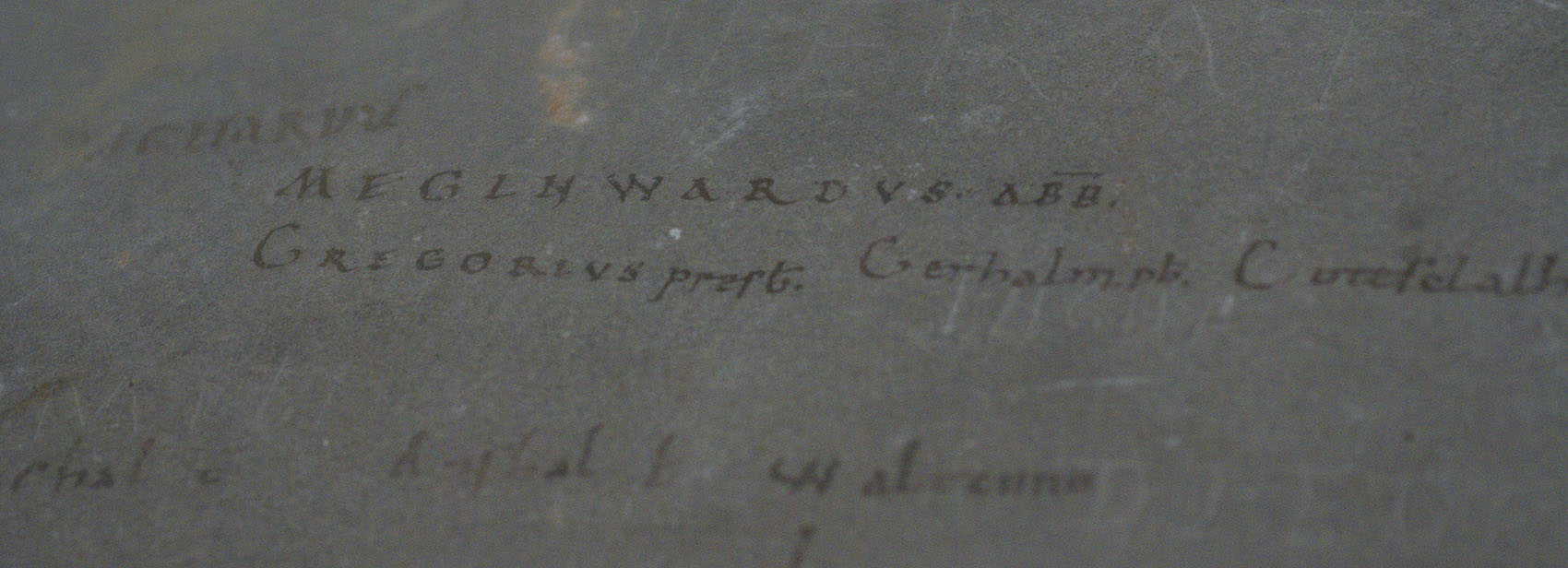 Die karolingische Altarplatte (nicht zugänglich) zeigt eingeritze Namen von Reichenauer Verbrüderungs- und Gebetsgemeinschaften (unten, digital aufgehellt und Originalansicht)