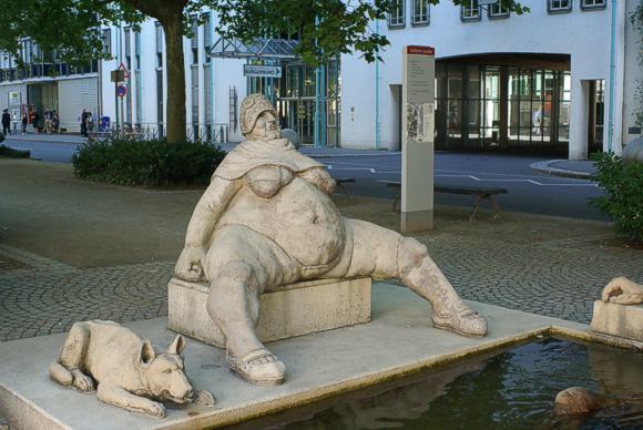 Der 1991 fertiggestellte "Triumphbogen" oder "Laubebrunnen" in der Unteren Laube lässt "in antikisierender Bogen- und Brunnenarchitektur Liebesschönheit, Wasserlust und Jugendkeckheit mit Altersfülle, abgasverängstigten Engeln und den historischen Kutschensturz eines Papstes" zusammentreffen. Hauptthema in der Fülle seiner durchweg ironisch-satirischen Figuren ist der Verkehr: Wohlstandsbürger baden sichtlich selbstzufrieden im Verkehrsfluss, halbnackte Rocker und Affen spucken drauf, schon Kleinkinder halten sich begierig auf Fortschritt am Lenkrad fest, Engel tragen schließlich Gasmasken. Mitten im Brunnen steht die üppig-geformte "Constantia", gierig begafft von alten Männern und Erdferkeln.