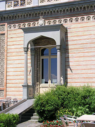 Baudetails des "maurischen" Stils: Vorbau mit Säulen, "maurische" empfundenem Bogen und dem Montforter Wappen.