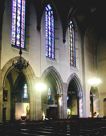 Unten Chor des neugotischen Baus von 1866. An den Chorwänden Tafelbilder mit der Passion Christi, um 1480, aus der früheren Magdalenenkirche.