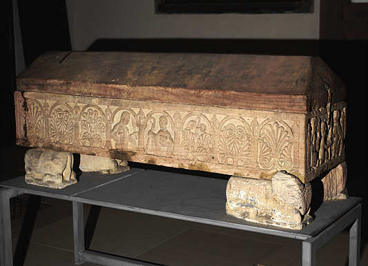 Rückseite: Reihe von 8 Arkaden, in den mittleren Feldern ein Bischof Adeloch (mit Stab) vor einer segnenden Heiligen (mit Palmzweig).