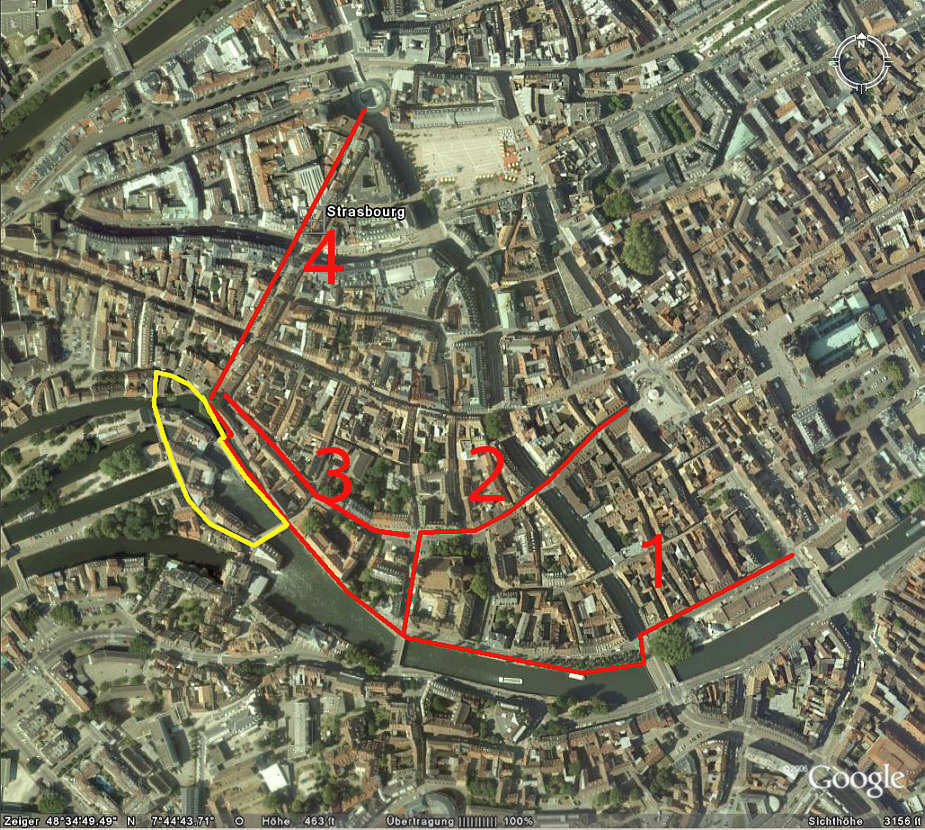 Ein sehr schöner Weg führt an der Ill entlang (Zugang hinter der Ancienne Douane - 1 - oder von St Thomas aus - 2 - ). Der Weg ist schön, hat aber wenig Sitzbänke. Direkter gehts über St. Thomas und die Rue de la Monnaie (3) oder von der Place de l'Homme de Fer aus über die Fossé des Tanneurs (Gerbergraben, 4).