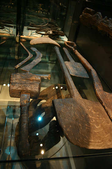 Vitrine mit Funden hölzerner Werkzeuge: Hammer, Spaten etc .