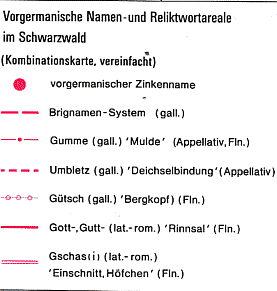 Übersichtskarte der vorgermanischen Namen und Reliktworträume im Mittleren und Südlichen Schwarzwald als Kennzeichen der Siedlungsräume der gallorömischen Bevölkerung zwischen dem 3. und 8. Jahrhundert. Wolfgang Kleiber: Sprachliche Kontinuität an Mosel und Mittelrhein, am Oberrhein und im Schwarzwald. Eine vergleichende Skizze. In: Aspekte und Probleme der römisch-germanischen Kontinuität. Sprachkontinuität an Mosel, Mittel- und Oberrhein sowie im Schwarzwald. Stuttgart: Steiner, 1992. Karte 64 |