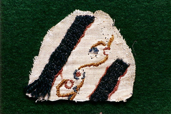 Originalfragment vom Teppich von Bayeux (6,5 x 7,5 cm) aus dem 11. Jahrhundert. Es stammt von der oberen Randborte über Szene 55 – 56. Zu erkennen ist der sog. Bayeux-Stich. (Bild © Médiathèque municipale de Bayeux – Fotografie Vincent Cazin)