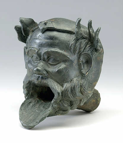 Bronzener Wasserspeier in Gestalt eines Silenskopfs aus Niedernburg. 2./3. Jh. n. Chr.