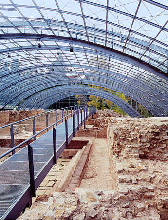 Blick nach Westen, Im Vordergrund von der Besucherbrücke überdeckt eines der Badebecken der 2. Baustufe