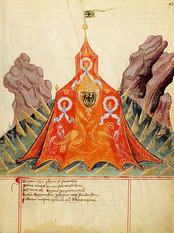 Konrad Kyeser: BellifortisKönigszelt im Feldlager Bilderhandschrift, Pergament, 34 x 28 cm Konrad Kyesers Bellifortis stellt wohl die bekannteste militärwissenschaftliche Bilderhandschrift des Spätmittelalters dar. Er widmete dieses Werk König Ruprecht, hatte es jedoch, wie die Initialen auf dem Königszelt zeigen, zunächst König Wenzel zugedacht. |
