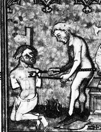 RechtspflegeHinrichtung durch Brennen mit glühenden Eisen Übersetzung "Die Politik und Ökonomik des Aristoteles" von Nicole Oresme, Paris, nach 1372