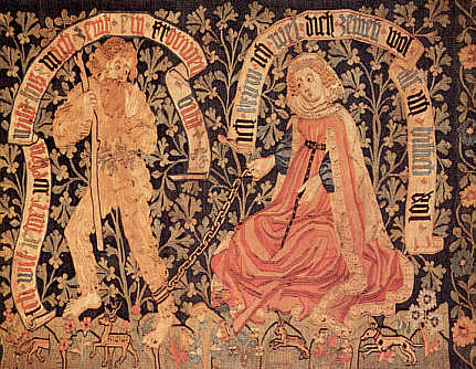 Tugendreiche Dame zähmt WildmannWandbehang, Basel, um 1470/80 Eine elegante junge Dame hält einen Wildmann an der Kette.