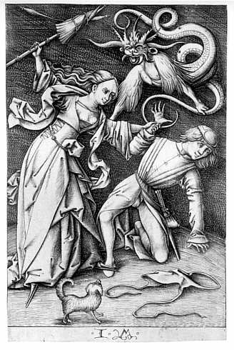 Israhel van Meckenem (1440/1445 - 1503) Blatt aus der zwölfteiligen Folge von Kupferstichen "Szenen aus dem Alltagsleben" , die anekdotisch und satirisch das Verhältnis zwischen Frau und Mann beschreibt. |