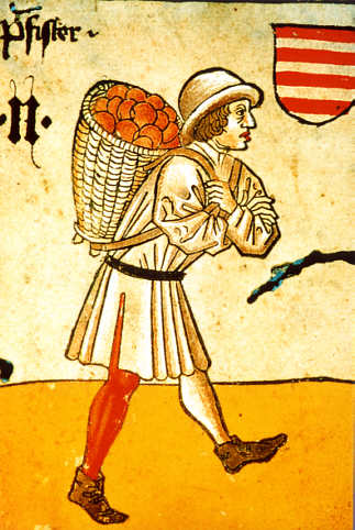 südwestdeutsch, um 1450 Der Bäcker Der Bäckr, im oberdeutschen Raum auch Pfister genannt, wird nicht bei der Herstellung von Brot gezeigt, sondern beim Austragen der fertigen Brote in einer Trage aus Weidengeflecht. |