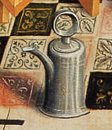 Auf dem Boden steht eine große Zinnkanne mit verschraubbarem Deckel.