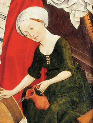 Oberrheinischer Meister: Die Geburt Mariens. Um 1460/65 Auch diese Frau trägt ein einfach geschnittenes Kleid mit Rundhals-Ausschnitt und ein weißes Kopftuch. Die Ärmel hat sie hochgekrempelt |