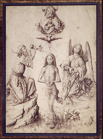 um 1450 Komposition mit betont geometrischer Struktur, die die Trinität - Vater, Heiliger Geist und Sohn - in der Mittelachse anordnet. Gottvater erscheint in ein Dreieck eingeschrieben, das sich sowohl im Oberkörper Christi als auch in der Gesamtkomposition mit Johannes des Täufer und dem Engel wiederholt. |