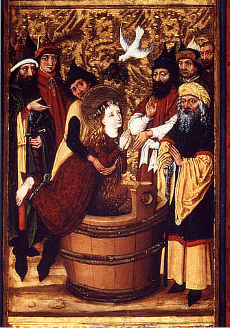 Margarethas zweite Marter: Der Versuch, Margaretha in einem mit Eiswasser gefüllten Bottich zu ertränken, misslingt