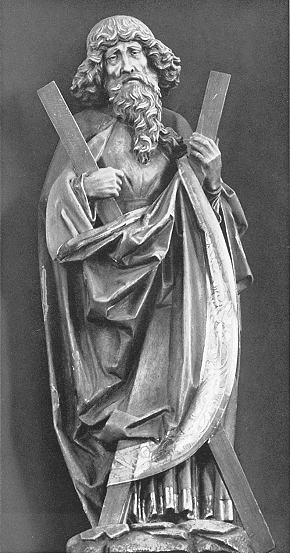 Lindenholz, Höhe 111,5 cm Andreas hat gegenüber Patrus eher melancholische Züge. Sein Attribut ist dasAndreaskreuz, über dessen einen Schenkel das Gewand des Apostels geschlagen ist. Auch dieses zeigt die großen Falten der Petrus-Figur. |