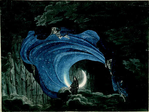 Simon Quaglio, Simon Quaglio, Bühnenbildentwürfe zur Zauberflöte, München 1818, Aquarell, (Deutsches Theatermuseum München): Königin der Nacht