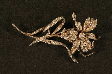 Die Freude am Luxus überlebte die Französische Revolutions- und die Biedermeierzeit und lebte anlässlich der Hochzeit des französischen Kaisers Napoleon III. mit Eugénie de Montijo ,Gräfin von Teba, wieder auf. Wie Marie Antoinette, ihr großes Vorbild, war Eugénie verrückt nach Diamanten und bereicherte den Kronschatz um unzählige Neuankäufe. Dem Hofjuwelier G. Lemonnier aus der Rue Richelieu 92 schreibt man die Erfindung einer Spiralfeder zu, die in einer goldenen Kapsel ruht, auf der ein Stift sitzt, der als Träger der Blüten dient. Jede noch so geringe Bewegung lässt die Feder erbeben und die Blüte ins Schwanken bringen. So entsteht ein Effekt, der wie die natürliche Bewegung einer vom Wind gestreiften Blüte wirkt. Man nannte diese Gebilde Trembleusen ( Zitterbroschen). Sie wurden zu den am meisten getragenen Schmuckstücken. Bis in die Zeit des Jugendstil bleibt die Zitterbrosche Favorit und passt sich mit ihren züngelnden, asymmetrischen Blütenblättern dem neuen Stil an, wobei die Verarbeitung noch immer traditionell ist. Die hier vorgestellte Brosche zeigt exemplarisch die Verwendung der Fuchsie als Vorlage. Das zeitgleiche Kleid in der Textilpassage weist das gleiche Design als à jour geklöppelte Spitzen auf der Corsage.