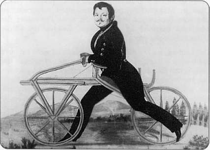 Voller Stolz posierte Freiherr Karl von Drais auf diesem von ihm entwickelten Modell. 1818 hatte ihm der Großherzog von Baden hierfür das Patent erteilt. Eine Revolution in der individuellen Fortbewegung des Menschen war geschehen, denn mit dieser sog. Draisine konnte eine Strecke von 15 km, damals etwa 4 Poststunden, in nur 1 Stunde zurückgelegt werden.