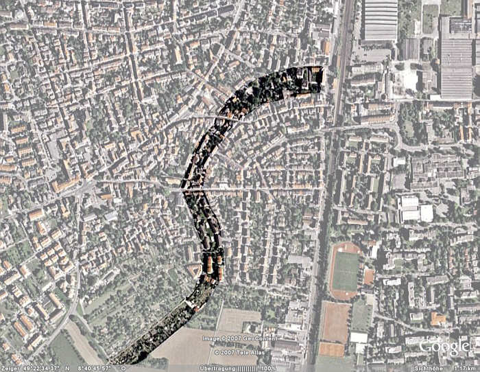 Hervorgehoben ist der Zuig des alten Neckarlaufs, der sich