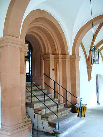 Romanisches Stufenportal des 12. Jahrhunderts, die Treppe datiert vom Neubau des Nordflügels im 18. Jahrhundert.