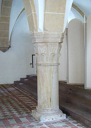 Mittelsäule mit einfachem Blattkapitell , dahinter die Stufen zum 1709 höhergelegten Südteil der Halle.
