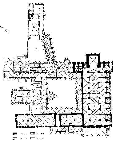 und dem Kapitelsaal (oben) liegen. Laientrakt und Mönchstrakt
