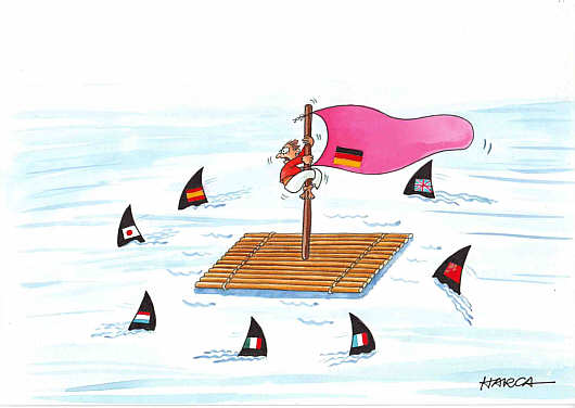 Ist die deutsche Sprache bedroht? So sieht es der Karikaturist Juli Sanchis Aguado © Juli Sanchis Aguado, Spanien 2001; Reproduktion: Stiftung Haus der Geschichte der Bundesrepublik Deutschland, Michael Jensch/Axel Thünker.