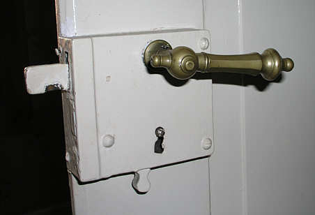 Gleichermaßen den Stilbegriff zur Bauzeit wie die Massenfertigung der Baudetails verraten die Fenster- und Türgriffe im Haus. Hier die gegossenen Türgriffe aus Messing an einem einfachcen Kastenschloss.