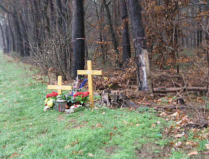 An der Unfallstelle (A 5) aufgestellte Gedenkkreuze für eine Mutter, die mit ihrer Tochter Opfer eines durch Raserei und Nötigung verursachten Unfalls wurde. Rechts im Wald die Unfallstelle