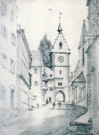 Franziskanertor mit dem Westgiebel der Franziskanerkirche (rechts an der Straße). Gegenüber der Salmansweiler Hof.