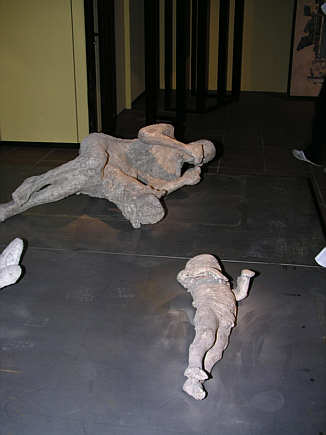Abguss der Leichen einer Familie, bestehend aus zwei Erwachsenen und zwei kleinen Kindern, das eine am Bauch der Mutter Schutz suchend.
