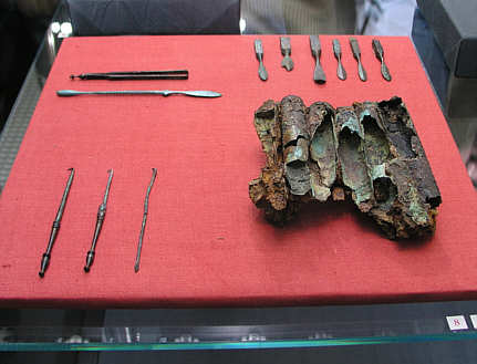 Besteck eines Chirurgen, bestehend aus Skalpellen und Spateln, zusammen mit einem verbackenen Bronzegehäuse, in dem vermutlich die Bestecke aufbewahrt wurden.