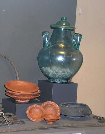 zweihenkliger Glaskrug als Urne, drei teller und drei Schälchen aus Terra sigillata; rechts eine Schale aus Terra nigra