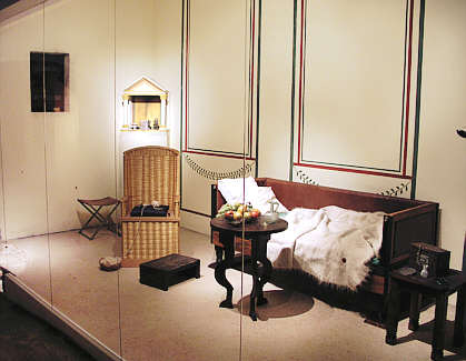 Korbsessel, Liege und Tischchen lassen sich durch zeitgenössische Abbildungen bzw. Funde rekonstruieren. Im Hintergrund in der Raumecke ein Larentempelchen