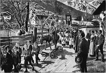 Im mittelalterlichen und frühneuzeitlichen Osterbrauchtum wurde von der Gemeinde am Palmsonntag der Einzug Christi in Jerusalem nachvollzogen. Dabei wurde eine hölzerne Figur von Christus auf dem Esel, oft auf Räder montiert, mitgeführt. |
