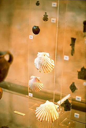 PilgerzeichenJakobsmuschelnJakobsmuscheln als Abzeichen der Pilgerfahrt nach Santiago de Compostela zum Grab des heiligen Apostels Jakob, unten als natürliche Jakobsmuschel, oben verkleinert in Bronze; bei den beiden oberen sind die Löcher zum Annähen an die Kleidung gut sichtbar. |