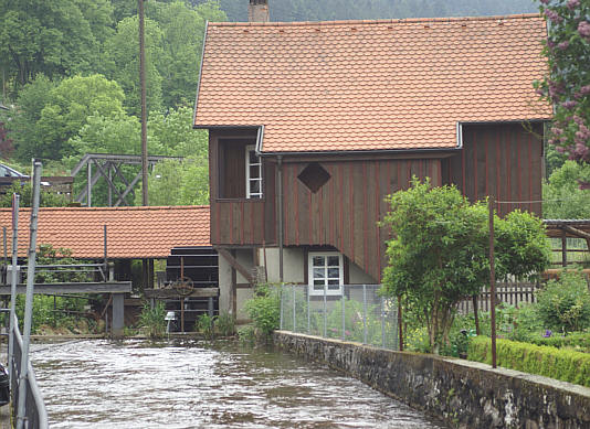 In der ehemaligen Schüttesäge ist ein Museum der Flößerei eingerichtet. Vor dem Bau der Eisenbahn war der Holztransport zu Wasser, auf langen Stammholzflößen, die einzige Möglichkeit, das geschlagene Holz zu den Märkten am Rhein zu bringen. Hier im Bild der Mühlenkanal und das Wasserrad der Schüttesäge. Beide Wasserräder der Säge laufen als unterschlächtige Räder, d.h. sie werden von der Strömung des Mühlenkanals angetrieben.