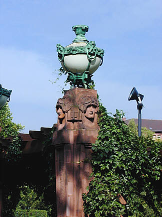 Sandsteinpfeiler mit Maske und Korb-Laterne am Laubengang in der Grünanlage