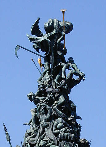 Grupello-Brunnen auf dem Paradeplatz Pyramiden-Spitze Über den Trophäen in einem kaum zu entwirrenden Knäuel die Laster (nicht einzeln definiert), gegen die Herkules mit seiner Keule kämpft. Der Held wird dabei von vier Löwen unterstützt. |
