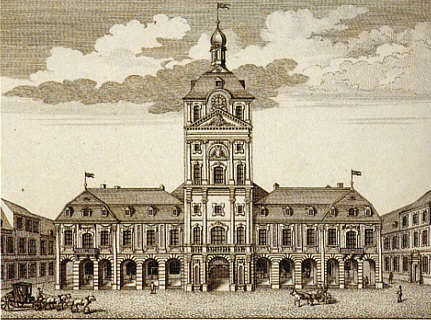 Die "Regierung" 1725 begründetes, 1733/35 - 1741 errichtetes Gebäude im Quadrat N 1 für Regierungsdienststellen, nach den Verkaufsläden unter den Arkaden auch "Kaufhaus" genannt. Typische Mannheimer Mittelturm-Fassade. |