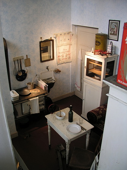 Rekonstruktion einer Wohnküche mit Kohleherd und Sofa (rechts